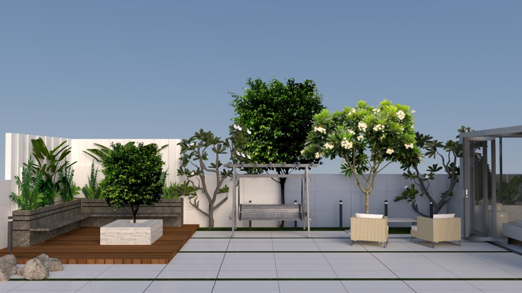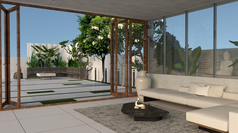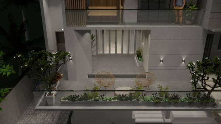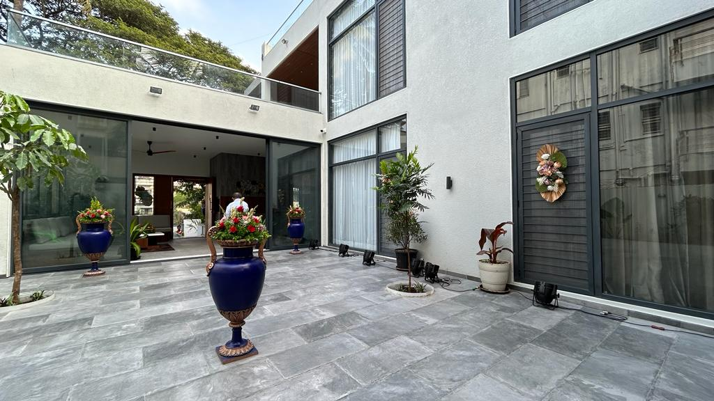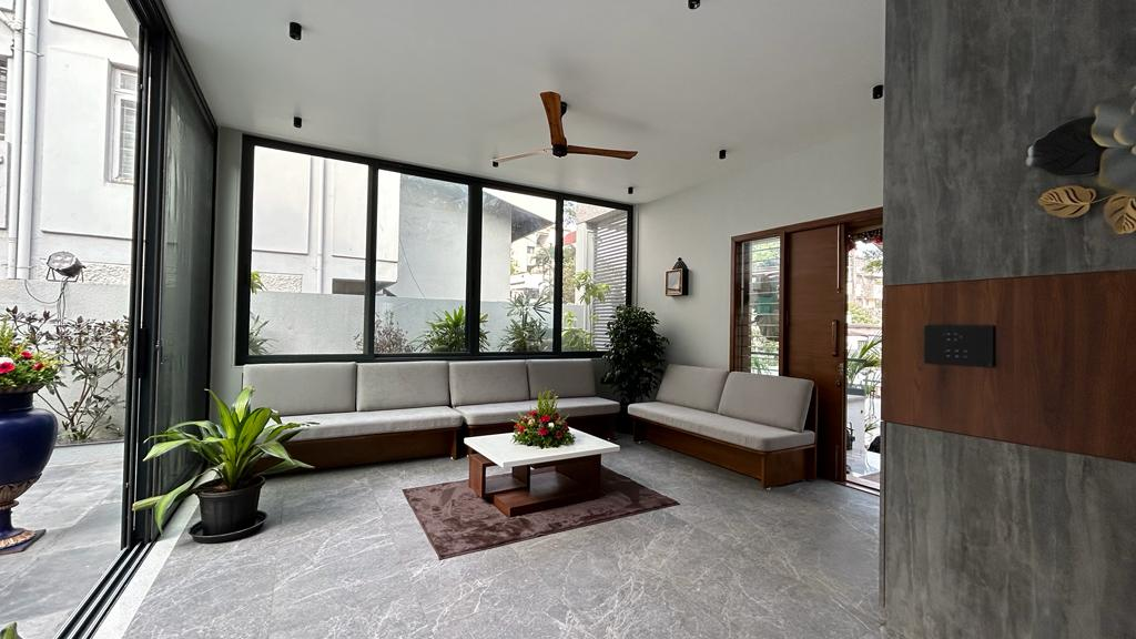 Vertical greenery and curated indoor plants are thoughtfully integrated to soften the bold volume, bringing freshness and a connection to nature into the home.