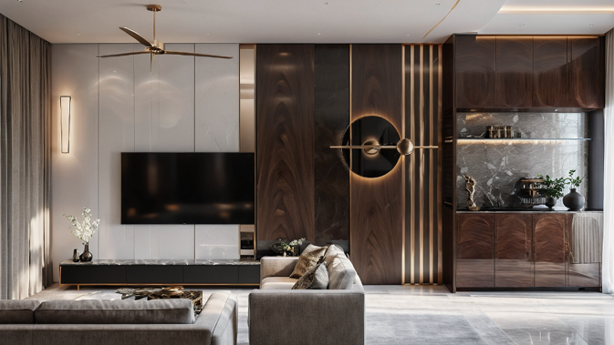 incorporated materials like wood, glass, textured finishes to create visual depth while