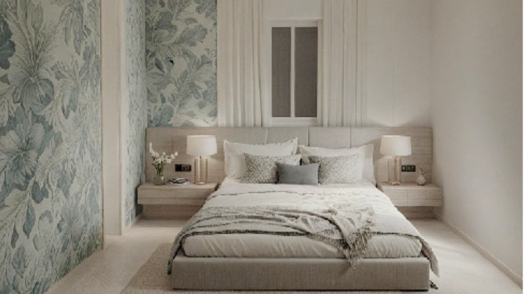 We used a neutral palette accented with monochromatic colours and customised wallpapers, and